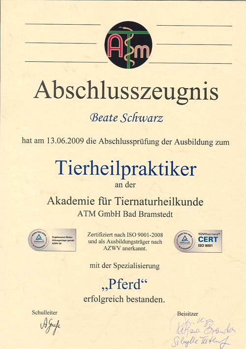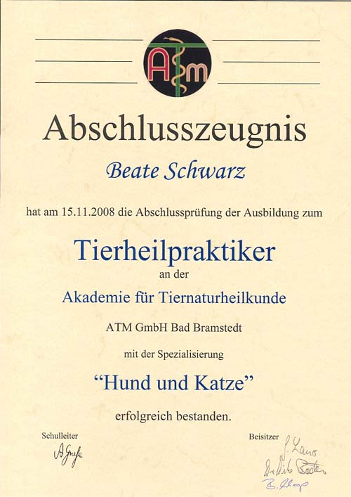 Zunächst absolvierte ich eine Ausbildung zur Tierheilpraktikerin bei der "Akademie für Tiernaturheilkunde" in Bad Bramstedt, die ich mit den erfolgreich abgelegten Prüfungen für Kleintiere und Pferde beendete. Tierärzte, veterinärmedizinische Universitätsdozenten und erfahrene Tierheilpraktiker vermitteln dort fundierte Kenntnisse im Bereich Anatomie, Physiologie, Pathologie, sowie Grundlagen in verschiedenen Therapieverfahren. Eine umfangreiche praktische Ausbildung gehört ebenfalls zu den Ausbildungsinhalten der Schule.